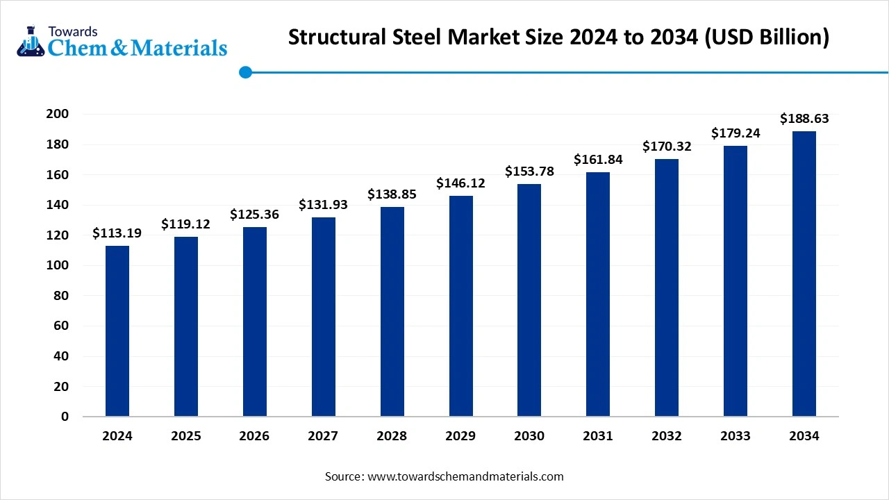 According to Towards Chemical and Materials, the global structural steel market size is calculated at USD 119.12 billion in 2025 and is expected to surpass around USD 188.63 billion by 2034, growing at a compound annual growth rate (CAGR) of 5.24% over the forecast period 2025 to 2034.